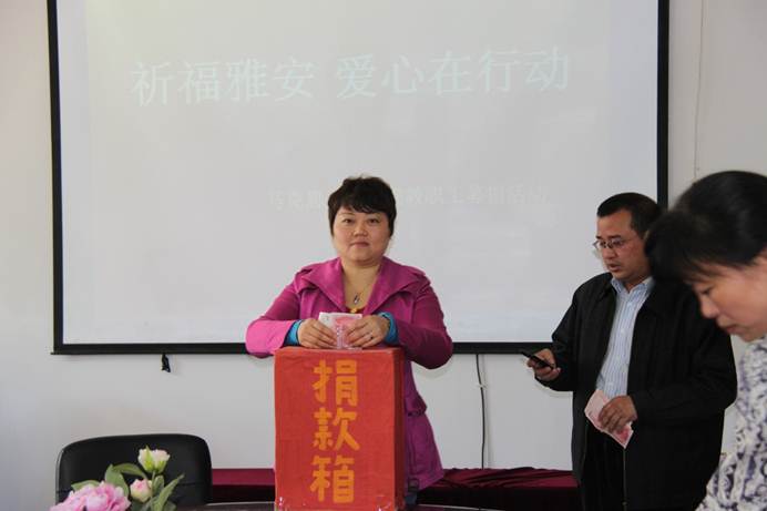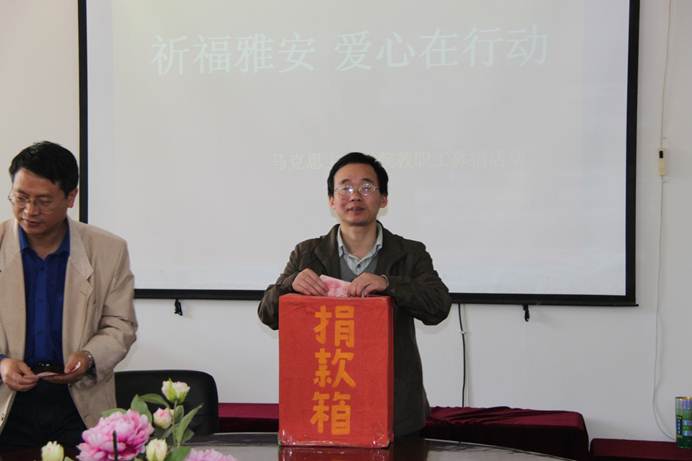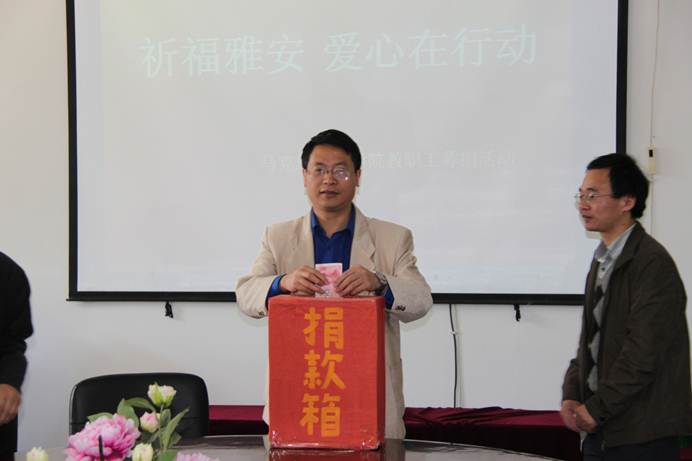 72886必赢积极响应学校工会的号召, 4月26日,学院向雅安芦山地震灾区进行捐款,学院党总支书记杨文武教授,院长欧阳恩良教授,副院长汪勇教授、副院长杨近平教授带领全体教职员工积极向地震灾区捐款。