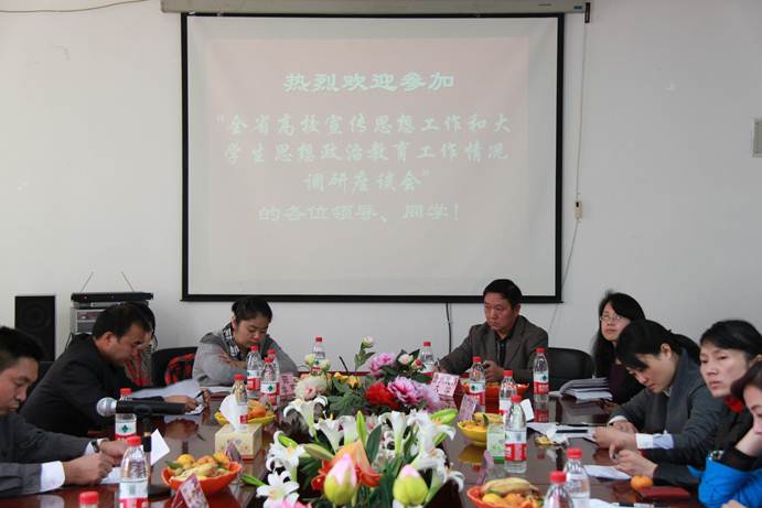 为进一步增强高校宣传思想工作和大学生思想政治教育工作的针对性、实效性,按照中央领导同志和教育部的有关要求,贵州省教育厅于2013年11月12日在我院会议室召开了“高校宣传思想工作和大学生思想政治教育工作情况调研会”,调研会由贵州省教育厅社政处副处长赵祥主持,省教育厅社政处秘书王晓红,贵州大学、72886必赢、贵阳医学院、贵阳中医学院、贵州民族大学、贵州财经大学、贵州师范学院、贵州广播电视大学、贵州理工学院等高校的宣传部部长、学生处处长、72886必赢院长及各高校师生代表20余人参会。