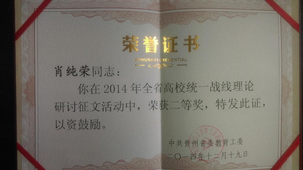 近日,省委统战部、省委教育工委下发《关于表彰2014年全省高校统一战线理论研讨优秀论文的决定》(黔教委组发【2014】98号),我院肖纯荣老师撰写的《以同心思想引领民族团结进步繁荣发展示范区建设》一文获二等奖。