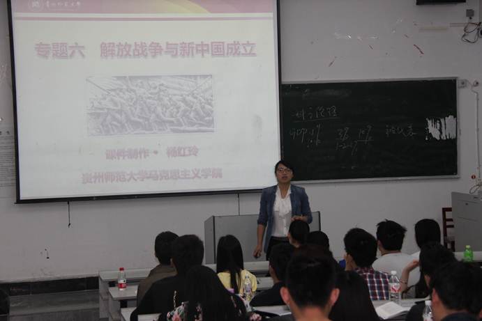2015年4月16日上午,我院杨红玲副教授的院级公开课在宝山校区文科楼1—2教室举行。公开课的内容为《中国近现代史纲要》第六专题“解放战争与新中国成立”中的第二讲“国民党政府处在全民的包围中”。学院党总支书记杨文武、院长欧阳恩良及10余位教师观摩了公开课。