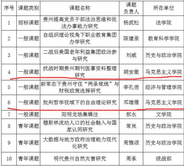 6月18日,贵州省哲学社会科学规划办公室公布《关于贵州省2015年度社科规划课题立项的通知》(黔社科规划〔2015〕11号),我校获批立项10项2015年度贵州省社科规划课题,72886必赢胡安徽博士、邓雄雁博士后每人获批一项。特此祝贺!