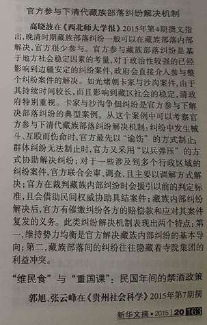 国家权威学术期刊《新华文摘》2015年第20期“论点摘编”摘登了我院高晓波博士发表于《西北师大学报(社会科学版)》(2015年第4期)的学术论文《官方参与下清代藏族部落纠纷解决机制——基于光绪朝甘青藏区卡家与沙沟争佃纠纷案例的分析》。