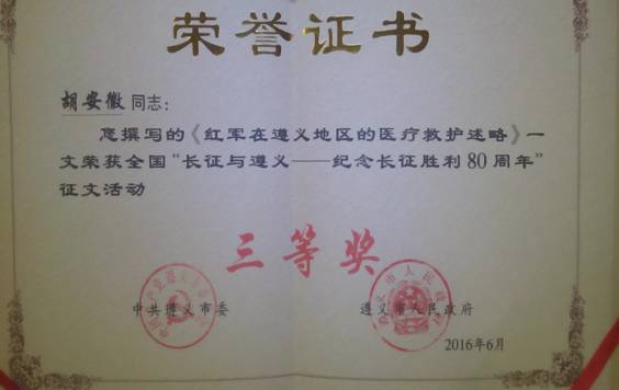 此次研讨会是在“长征与遵义——纪念长征胜利80周年”征文活动基础上举办的。征文面向全国,共评出一等奖2名、二等奖5名、三等奖10名,优秀奖31名。我院胡安徽博士提交的论文《红军在遵义地区的医疗救护述略》获三等奖。本次会议由来自中央党史研究室和中央文献研究室的领导、老一辈革命家后代、评审专家、论文作者代表、省内外专家和党史部门代表等近百人出席。老一辈革命家后代罗东进(罗荣桓元帅之子)、刘建(朱德元帅外孙)、李洋(李忠权将军之子),以及中央党史研究室副主任冯俊、贵州省委党史研究室主任杜丹等在大会上作了讲话。我院胡安徽博士作为论文获奖代表在大会上作了“红军在遵义地区医疗救护的再思考”主题发言。