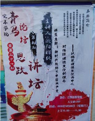 5月26日上午,应江西宜春学院72886必赢邀请,我院教授欧阳辉纯博士在宜春学院人文楼n207教室,作了题为《中国共产党对传统道德文化的使命——以儒家道德文化为中心》的学术报告。学术报告由宜春学院72886必赢副院长刘天杰教授主持,学院教师代表和学生代表70余人聆听了报告。